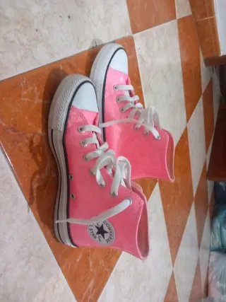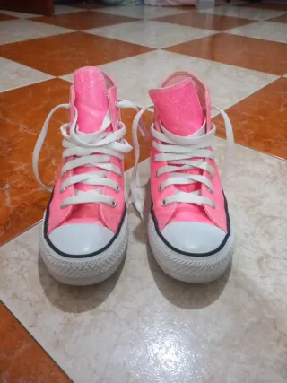 Botines Converse de caña alta con un llamativo acabado brillante. - Color rosa vibrante con detalles plateados. - Cordones blancos. - Suela blanca. - Diseño clásico de Converse.