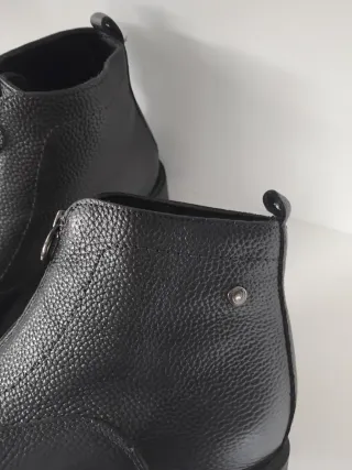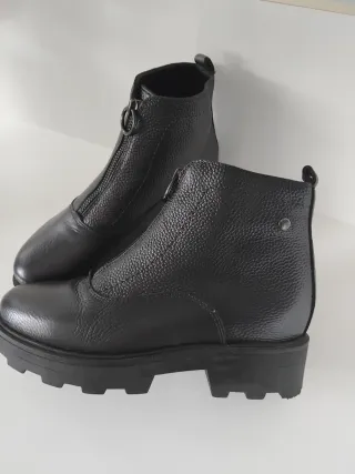 Botines de piel con un diseño moderno y cómodo. - Material exterior: Piel. - Cierre de cremallera frontal. - Suela gruesa y resistente. - Detalle de tirador en la parte trasera.