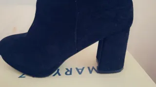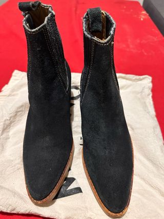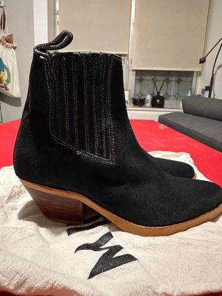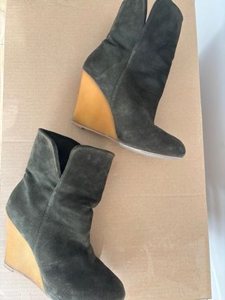 Botines de estilo moderno con tacón de madera. - Cierre de cremallera lateral. - Material exterior tipo ante. - Tacón cuadrado con acabado imitación madera. NUEVAS CON SU ETIQUETA a estrenar Son Originales Están en su caja original Sin defectos