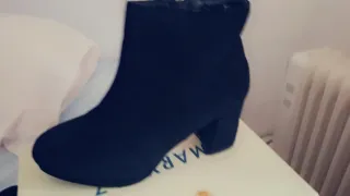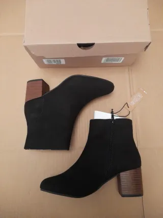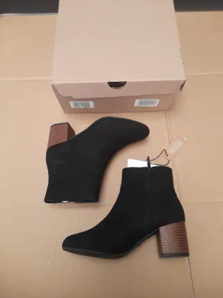 Botines negros elegantes, ideales para otoño e invierno. Tacón ancho de aprox. 8 cm, muy cómodo y estable. Punta fina que estiliza el pie. ✔️ Talla 38 ✔️ Cremallera lateral ✔️ Color negro (tipo ante) 📌 Estado: usados, con desgaste visible en el borde interior superior (ver últimas fotos). No afecta al uso ni a la estética exterior una vez puestos. Perfectos para diario, trabajo u ocasiones informales. Se envían limpios y bien protegidos.