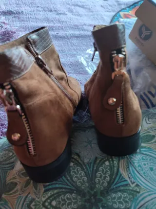 Nuevos a estrenar. Talla 39. Botines de la marca Kylie estilo campero. - Diseño de ante con detalles troquelados en la caña. - Cierre lateral con cremallera. - Adorno lateral de cremallera con flecos. - Tacón grueso de goma cómodo. - Suela antideslizante. NO hago cambios ni envíos, recoger por mi zona