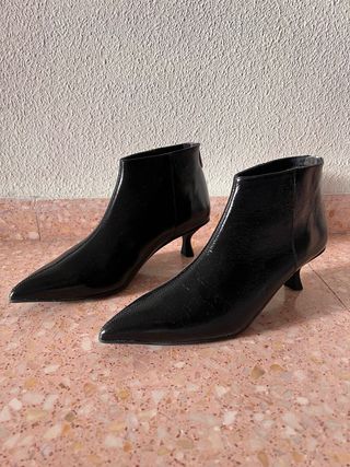 Botines elegantes de charol y piel. - Cierre con cremallera lateral. - Tacón cuadrado. - Punta cuadrada con detalle de escamas. precio negociable