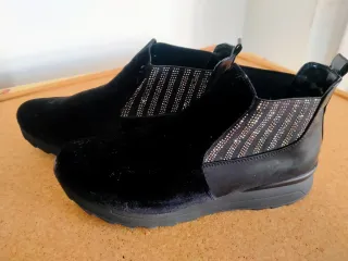 Botines elegantes de terciopelo negro con detalles brillantes. - Material exterior de terciopelo y goma. - Adorno de pedrería en los laterales, elástico. - Diseño tipo Chelsea. - Suela de goma.