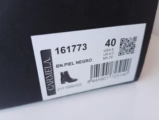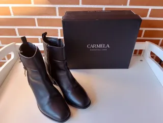Elegantes botines de vestir de la marca Carmela. - Diseño moderno y sofisticado. - Cremallera lateral interior para facilitar su uso. - Tacón cómodo para el día a día. - Cremalleras doradas lateral exterior de adorno. Solo me los he puesto en dos ocasiones especiales, pero definitivamente no puedo llevar botines por una metatarsalgia.