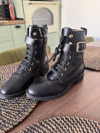 Botines de piel en color negro, talla 37. Cuentan con cordones y hebilla para un ajuste perfecto. - Material exterior: Piel. - Cierre: Cordones y hebilla. - Detalle de hebilla dorada