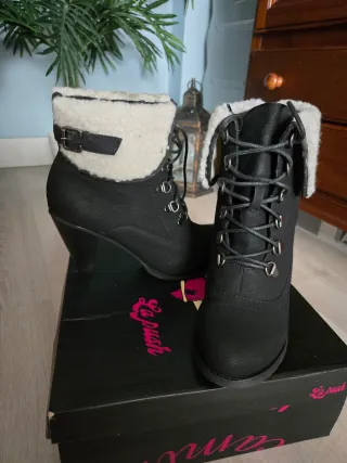 Botines negros con forro interior blanco y detalle de cordones. - Tacón alto tipo cuña. - Detalle de hebilla en el lateral. - Suela de goma.
