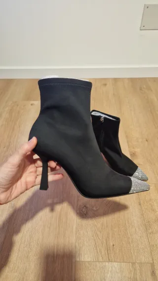 Elegantes botines negros con detalles brillantes en la punta. Material es elastico tipo neopreno. Altura tacón: 9cms aprox. Muy cómodos porque se ajustan con cremallera lateral. Puestos una sola vez. Tiene pequeña tara en la punta. Ideales para estas fiestas ✨️🥂🎆🎊 #botines #botín #botinesnegros #tacon #heels #inditex #Zara #glitter #party #partyoutfit #partydress #ankleboots #glitterankleboots #vintagestyle #purpurina #paillets #stivaletti #bottines #bottinesfemme #bottinesnoires #stiefeletten #stiefelette