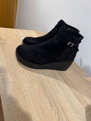 Botines elegantes de color negro con detalle de hebilla. - Material exterior tipo ante. - Suela de cuña. - Cierre de cremallera lateral.
