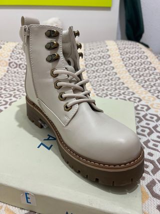 Botines de estilo militar en color blanco. Cuentan con cordones y cremallera lateral para un ajuste cómodo. - Diseño de caña alta. - Suela gruesa y dentada. - Detalle de tirador en la parte trasera.