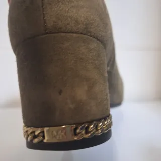 Botines de ante Michael Kors en color verde oliva con detalles dorados. - Cremallera lateral dorada. - Tacón con detalle de cadena dorada.