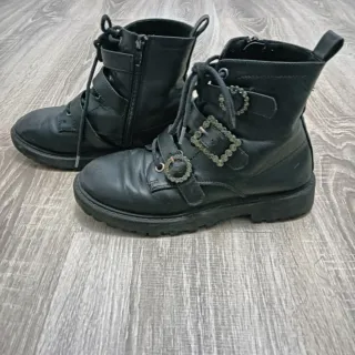 Botas negras para niña o mujer talla 35. - Cierre de cremallera lateral. - Detalle de correas con hebillas decorativas. - Puntera redonda.