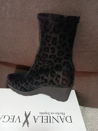 Botines de la marca Daniela Vega con un llamativo estampado. - Diseño tipo calcetín. - Tacón de cuña. - Estampado de leopardo en tonos negros y grises. Su precio original es 65€ las vendo a 20€ me quedan un 38 dos 39 y un 40
