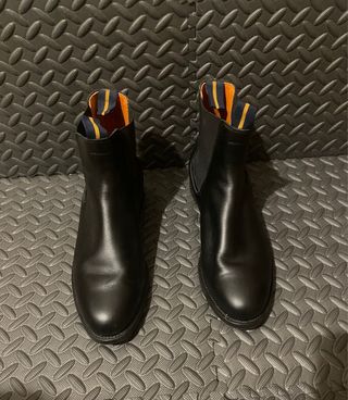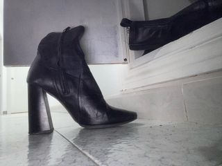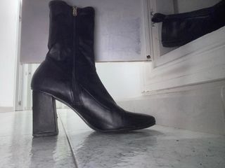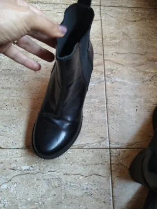 Dos pares de botines de piel. - Diseño Chelsea. - Tacón grueso. - Plataforma delantera. El otro como se observa en la foto. 6 euros los dos