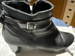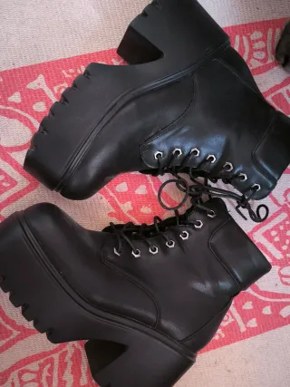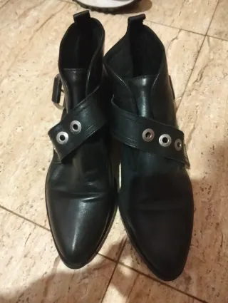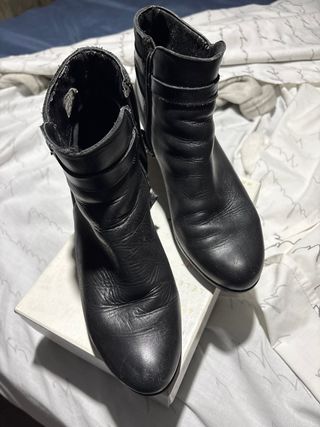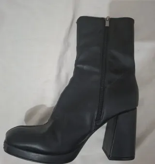 Botines de piel con plataforma. - Diseño moderno y versátil. - Tacón grueso y suela track. - Cierre de cremallera. - Artículo usado pero bien conservado. La piel se mantiene en buen estado y el único defecto, visible en fotos, es un leve desgaste en la goma del tazón y plataforma. - Son muy cómodos. **medidas** Largo (Calcetín): 12 cm Tacón: 8cm Plataforma: 3,5cm