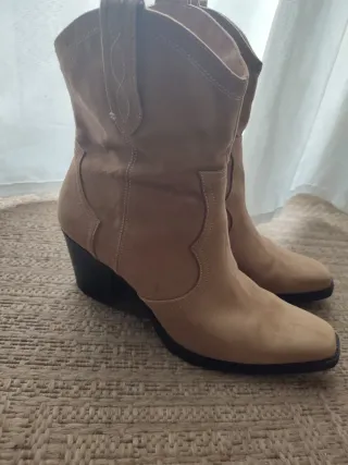Botines estilo cowboy en color beige. - Tacón cuña negro. - Punta cuadrada. - Detalle de costuras. - Material tipo ante.