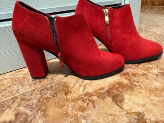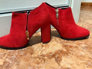 Botines de tacón en color rojo. - Material tipo ante. - Cierre con cremallera dorada. - Tacón grueso.