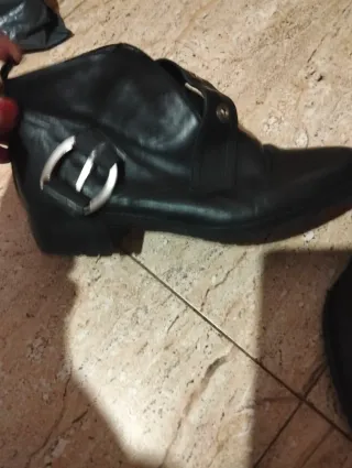 Botines negros con un detalle de hebilla dorada. Talla 39 - Diseño moderno y elegante. - Cierre de cremallera lateral.