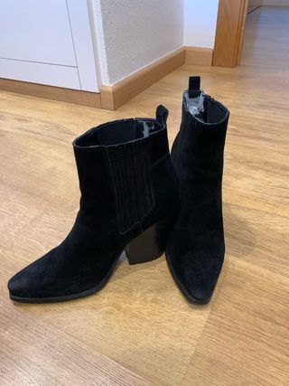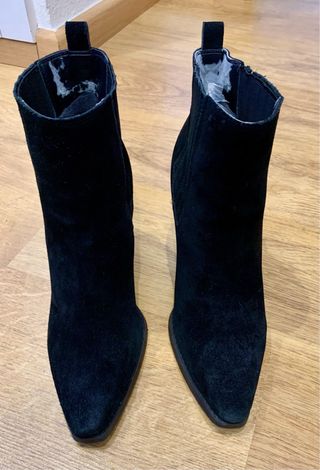 Botines negros de tacón con punta fina. - Material: Ante. - Tacón grueso y alto. - Diseño elástico en los laterales. - Talla 39 americana