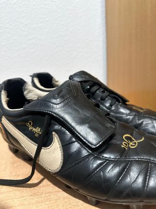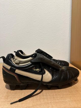 Botines de fútbol Nike Tiempo Ronaldinho R10 de la temporada 2006. Diseño clásico en color negro con detalles dorados y blancos. Talla 42.5 EUR Ideal para coleccionistas y amantes del buen fútbol. - Firma de Ronaldinho. - Número 10. - Logo de Nike.