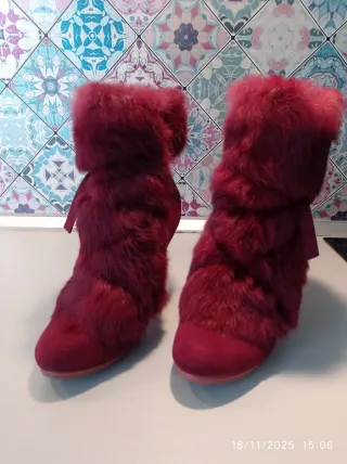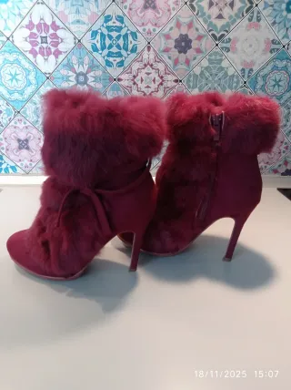 Botines de pelo con un diseño muy llamativo. - Material exterior de pelo. - Detalle de lazo en la parte trasera. - Suela de goma. - color burdeos
