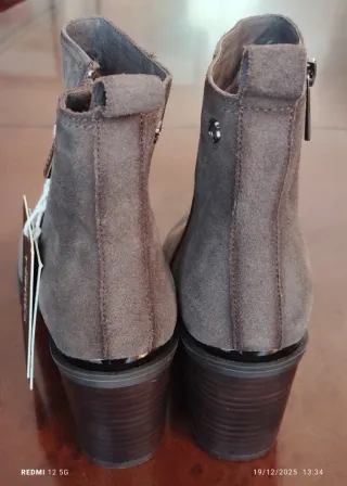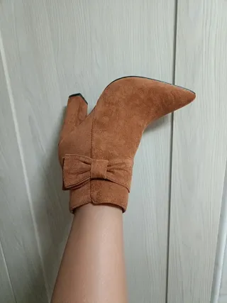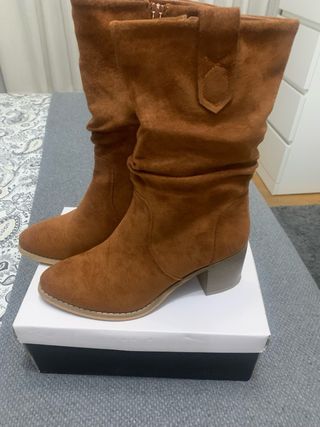 Botines de ante en color camel. - Diseño de caña arrugada. - Tacón cuadrado. - Cierre con cremallera. Tienen un pequeño raspón por lo demás como nuevo