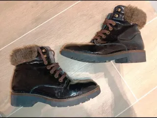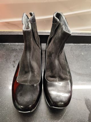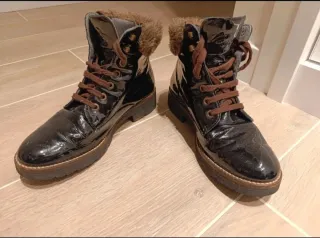 Botines de charol con cordones y cremallera lateral. - Diseño brillante. - Cierre de cordones. - Cremallera lateral para facilitar el acceso. - Muy buen estado. - Talla 37.