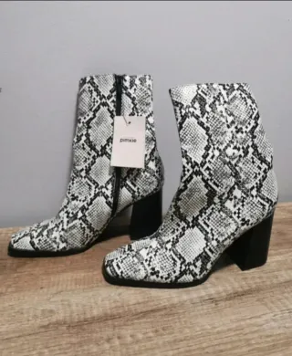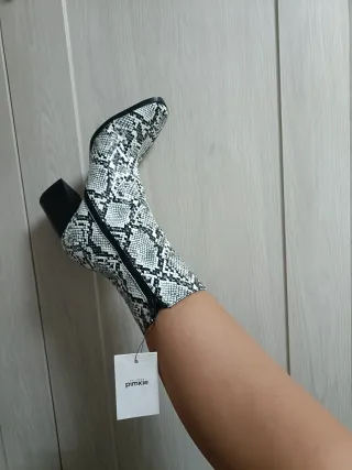 Botines de tacón con un llamativo estampado de piel de serpiente y plataforma interior que los hacen más cómodos al ser el tacón alto,son de Bershka a estrenar en número 38 - Diseño elegante y moderno. - Tacón alto para estilizar la figura. - Cierre de cremallera en la parte trasera.