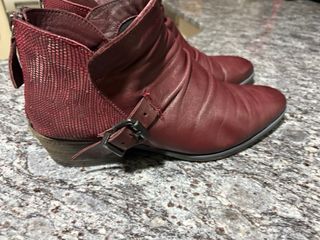 Botines de charol con un acabado brillante. - Diseño tipo Chelsea. - Detalle de picado en la puntera. - Suela gruesa y resistente. color vino tinto talla 38