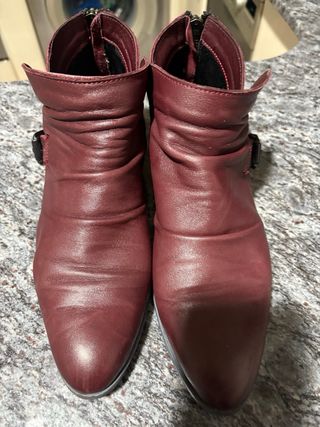 Botines de piel en color burdeos. Cuentan con un diseño moderno y cómodo. - Cierre de cremallera lateral. - Detalle de tirador en la parte trasera. - Suela de goma.