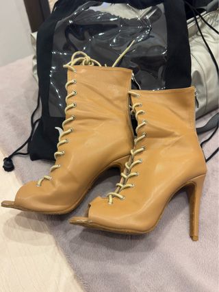 Botines de tacón Burju Sofiya con suela de ante. 🔹 Talla: US 7.5 (EU 38) 🔹 Tacón: Stiletto 4,7” (aprox. 12 cm) 🔹 Suela: ante 🔹 Color: Nude 3 Botines muy cómodos. Ajuste firme y buen soporte para el tobillo. Un único uso y bolsa original.