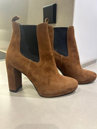 Botines de ante en color marrón con tacón. Son cómodos y elegantes. - Tacón grueso y estable. - Detalle de elástico lateral. - Tirador trasero para facilitar su puesta.