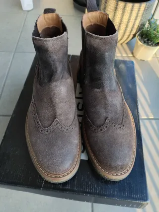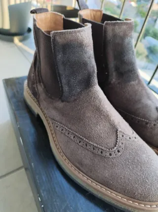 Botines de ante de la marca Casas modelo Klay en color marrón. Las vendo por que decoloran. Intenté arreglarlo con laca pero quedaron como podéis ver en las fotos, de ahí su precio. Nuevas valen 59€. Talla 42. - Diseño tipo Chelsea. - Detalle de picado en la puntera. - Suela de goma.
