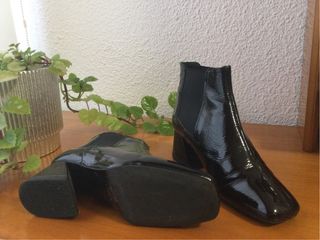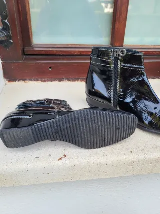 Botines de charol con un diseño moderno y elegante. - Acabado brillante. - Cierre de cremallera lateral. - Costuras decorativas en contraste.