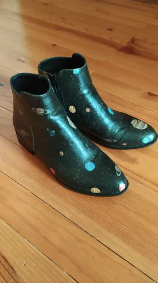 Botines negros con estampado de planetas y estrellas. Talla 36, marca DOGO. Cierre con cremallera lateral. Solamente los he usado 3 ó 4 veces.