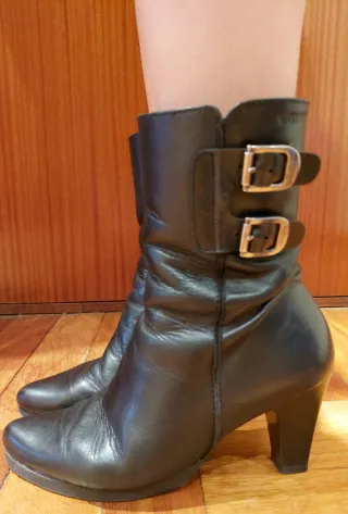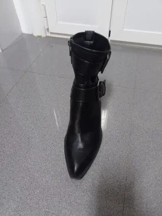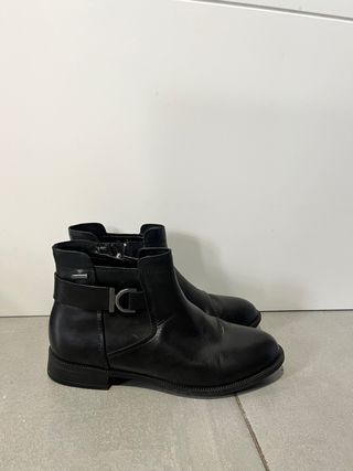 Botines de piel con un diseño moderno y detalles de hebillas. - Material: Piel - Color: Negro - Cierre: Cremallera lateral - Detalle: Dos hebillas metálicas decorativas Muy buen estado, apenas se han usado. Talla 38