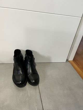 Botín Chelsea original de Zara, confeccionado en piel negra lisa. Diseño clásico y atemporal, con elásticos laterales y tirador trasero para un calce cómodo. Tacón bajo y suela resistente, ideal para el día a día. Precio del modelo nuevo 60 euros en la web de Zara. 🖤 Apenas usado, está en muy buen estado. 📏 Lo vendo porque me queda pequeño.