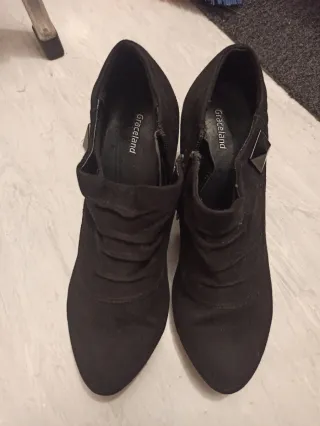 Botines de la firma “Pons Quintana”de Tacón con ligera plataforma. De Ante Negro con Detalle de Hebilla - Elegancia y Comodidad. Súper cómodos! Medida de tacón 8,5 cm / plataforma 2 cm Precio en tienda 295€ • Diseño: Botín de caña baja con un tacón cómodo y estable. • Detalles: Elegante tira de piel con hebilla metálica oscura en el tobillo que añade un toque sofisticado. • Cierre: Cremallera lateral para un calce rápido y fácil.