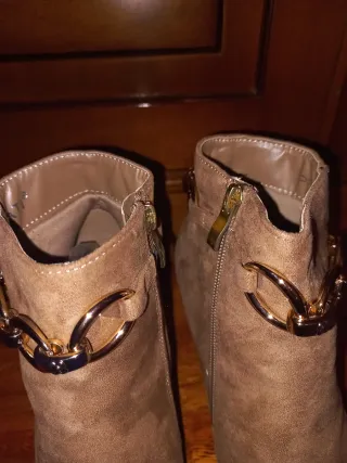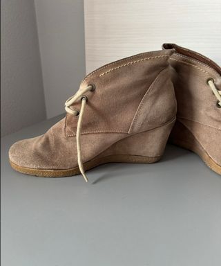 Botines de cuña en tono beige, perfectos para añadir un toque de estilo a tu atuendo. Miden 22cm - Diseño con cordones. - Acabado en ante. - Detalle de costuras decorativas.