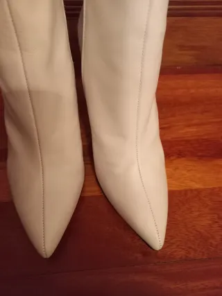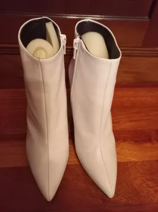 Botines elegantes de color blanco, perfectos para complementar cualquier atuendo. - Diseño de punta afilada. - Cierre de cremallera lateral. - Tacón alto y fino.