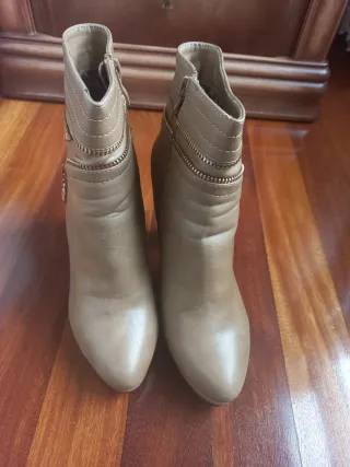 Botín de estilo casual en color beige. - Diseño con tachuelas. - Tacón de bloque de madera.