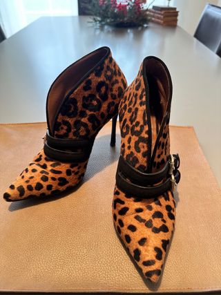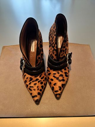 Elegantes Botines/Tacones de Tabitha Simmons con un llamativo estampado animal. - Diseño de punta afilada. - Tiras de ante negro con hebillas. - Tacón de aguja.