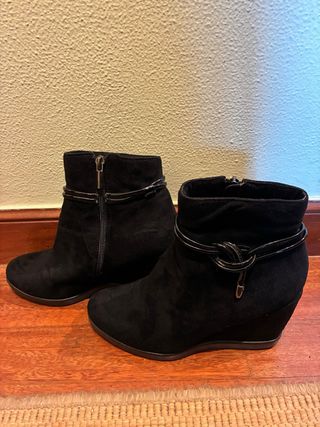 Botines de ante negro con un diseño moderno y elegante. - Material exterior de ante. - Detalle de tira con nudo y acabado brillante. - Cierre de cremallera lateral. - Suela de cuña para mayor comodidad.