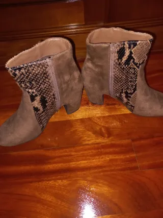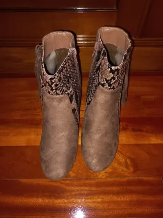 Botines de estilo moderno con un diseño llamativo. - Detalle de estampado de serpiente en la parte superior. - Acabado en ante. - Cierre de cremallera lateral. - Adorno de flecos.