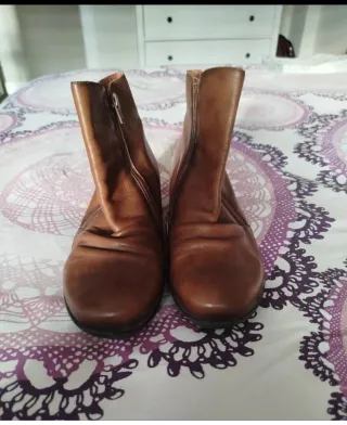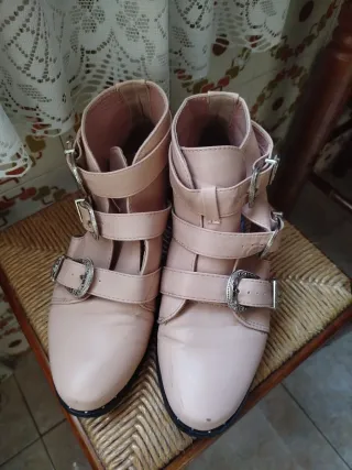 Botines tipo piel con un cálido forro interior. - Detalle de cremallera lateral. - Correa decorativa con hebilla y tachuelas. - Suela gruesa con buen agarre. Buen estado, talla 38. Sin marca visible.