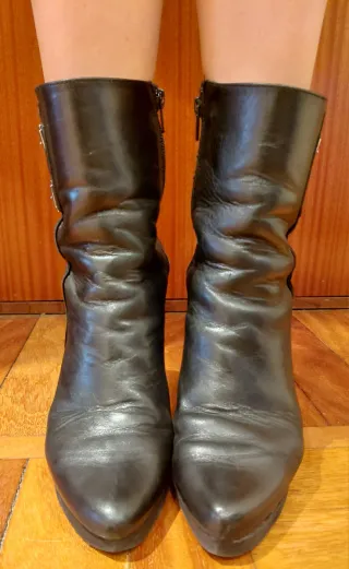 Elegantes botines de piel con un diseño moderno. Número 36, calza grande, da para un 37 - Material: Piel. - Cierre: Cremallera lateral. - Punta: Fina. - Tacón de 8 cm