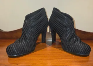 Elegante botín de la marca United Nude. Como nuevo, usado un par de veces - Diseño atemporal. - Acabado en negro. - Material con textura de rayas verticales. -Incluye repuestos para los tacos y bolsas para cada zapato.