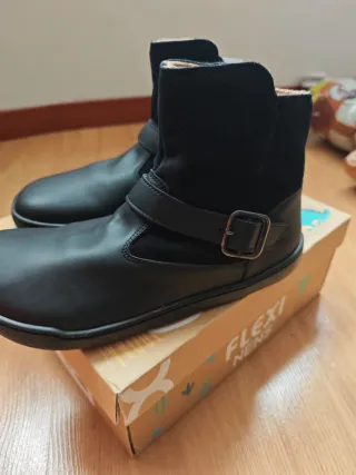 Botines de la marca Flexi Nens en color negro. Horma ancha barefoot. Con pelo interior. Modelo 9071-X - Diseño con correa y hebilla. - Combinación de materiales. - Suela flexible.