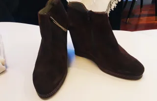 Botines de ante en color marrón. Talla 39 de casa Clergerie, 38.5 europea - Cierre de cremallera lateral. - Tacón de cuña transparente. - Detalle de logo en la cremallera.