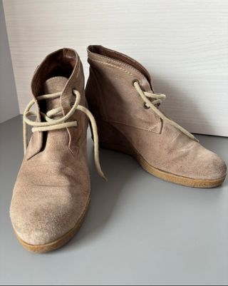 Botines de ante en color beige. Botines de la marca pekas, en ante color beige/marrón claro, con diseño de cordones, cuña interior y suela antideslizante. Están algo desgastados como se puede ver en la suela pero en buen estado. - Material: Ante - Cierre: Cordones - Diseño: Botín - Tacón: Cuña