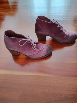 Botines de ante en un bonito tono rosa/morado. Tallan pequeño. Perfectos para añadir un toque de color a tu atuendo. - Cierre con cordones. - Tacón grueso.